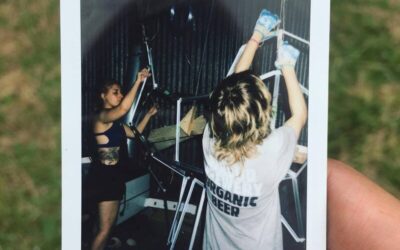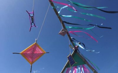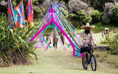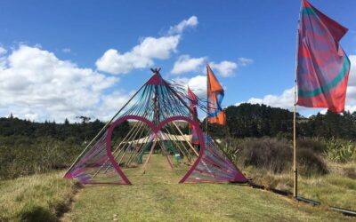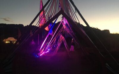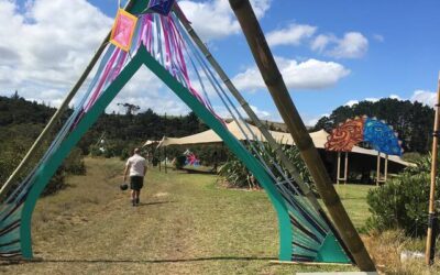 The concept of the walkway was devised by the Art Lead and reflects the Earthbeat logo. As a member of the art team, myself and 3 others then produced and installed the two arches and the supporting bamboo structure.